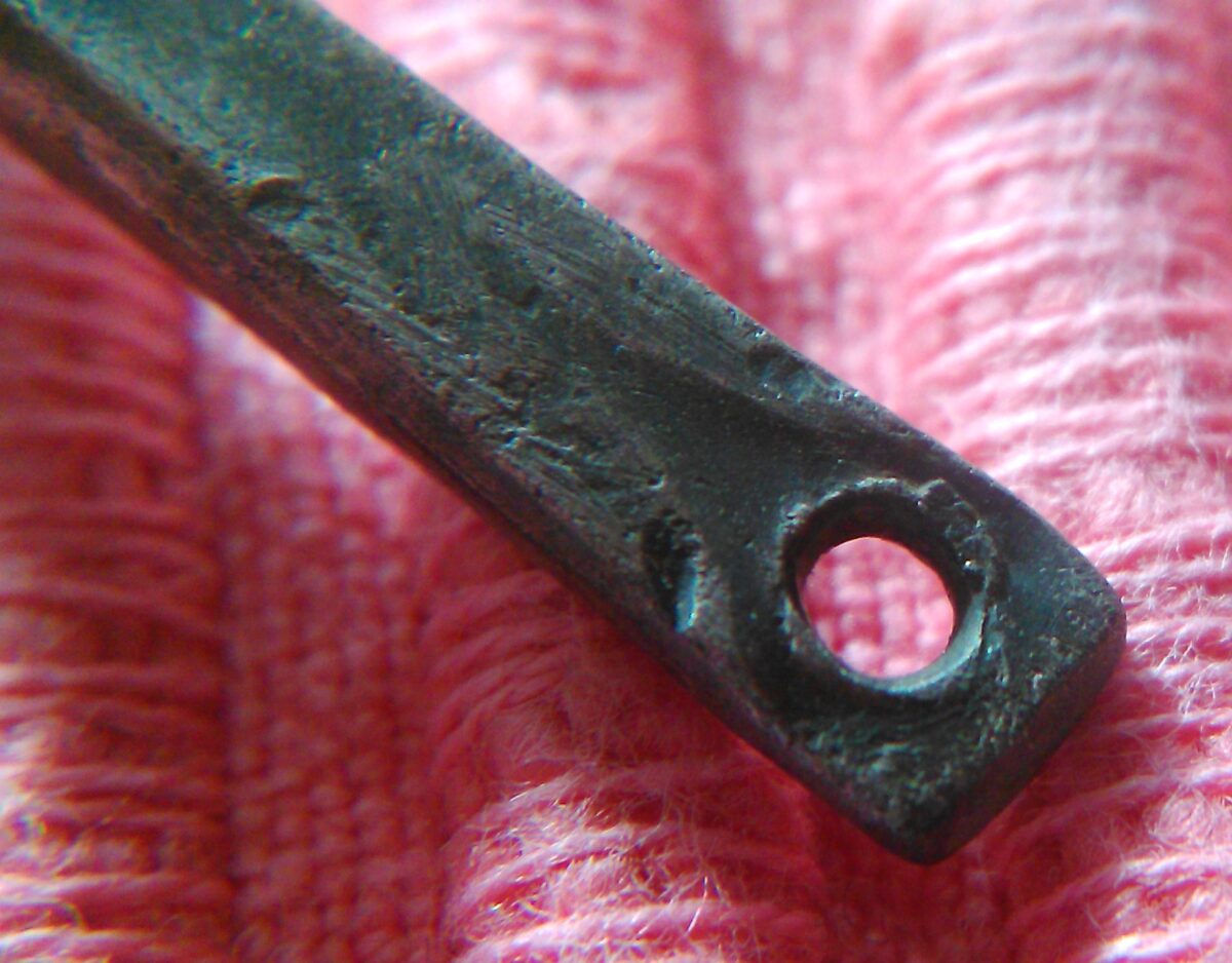 Gjenstanden er gjennomhullet helt øverst i skaftets ende.