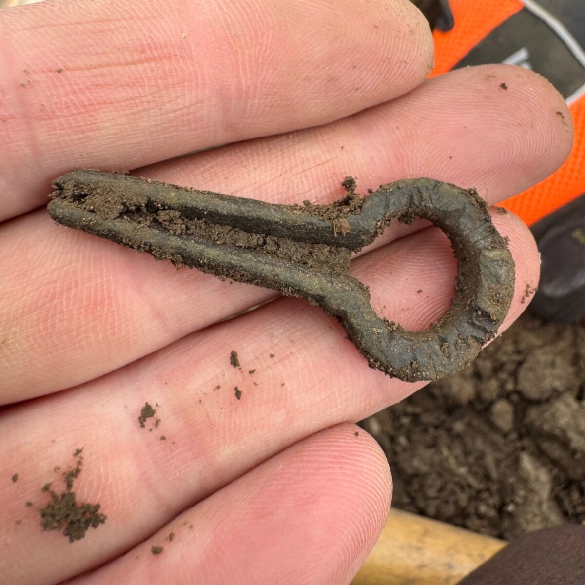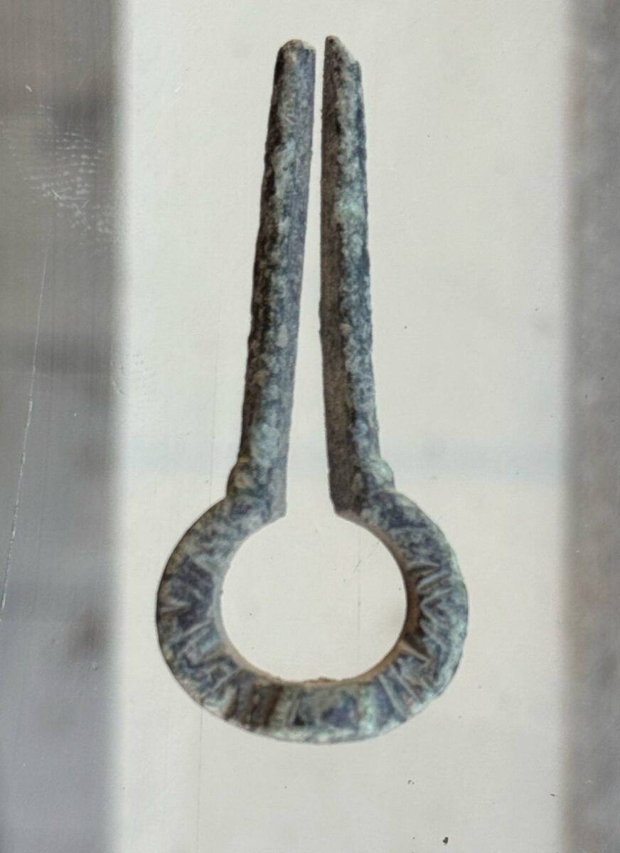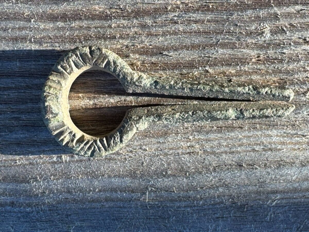 Beskrivelse: Grindheim i Etne harpa. Dekorert med dype skråstilte streker og furer. Funnet så undrende, der ute i den gode potetåkeren. Den gir nok ikke lenger noen lyd, da den under tiden har mistet sin tunge, den har tapt sin fjær. Materiale: Kobberlegering Lengde: 49 mm Bredde: 21 mm Funnet av: Jan Terje Rafdal Dato: 13 april 2025 Fylke: Vestland Kommune: Etne Type terreng: Dyrket markDetaljer: