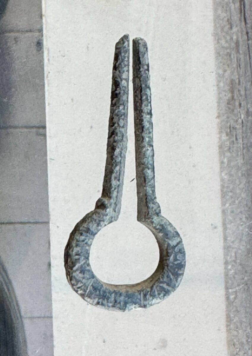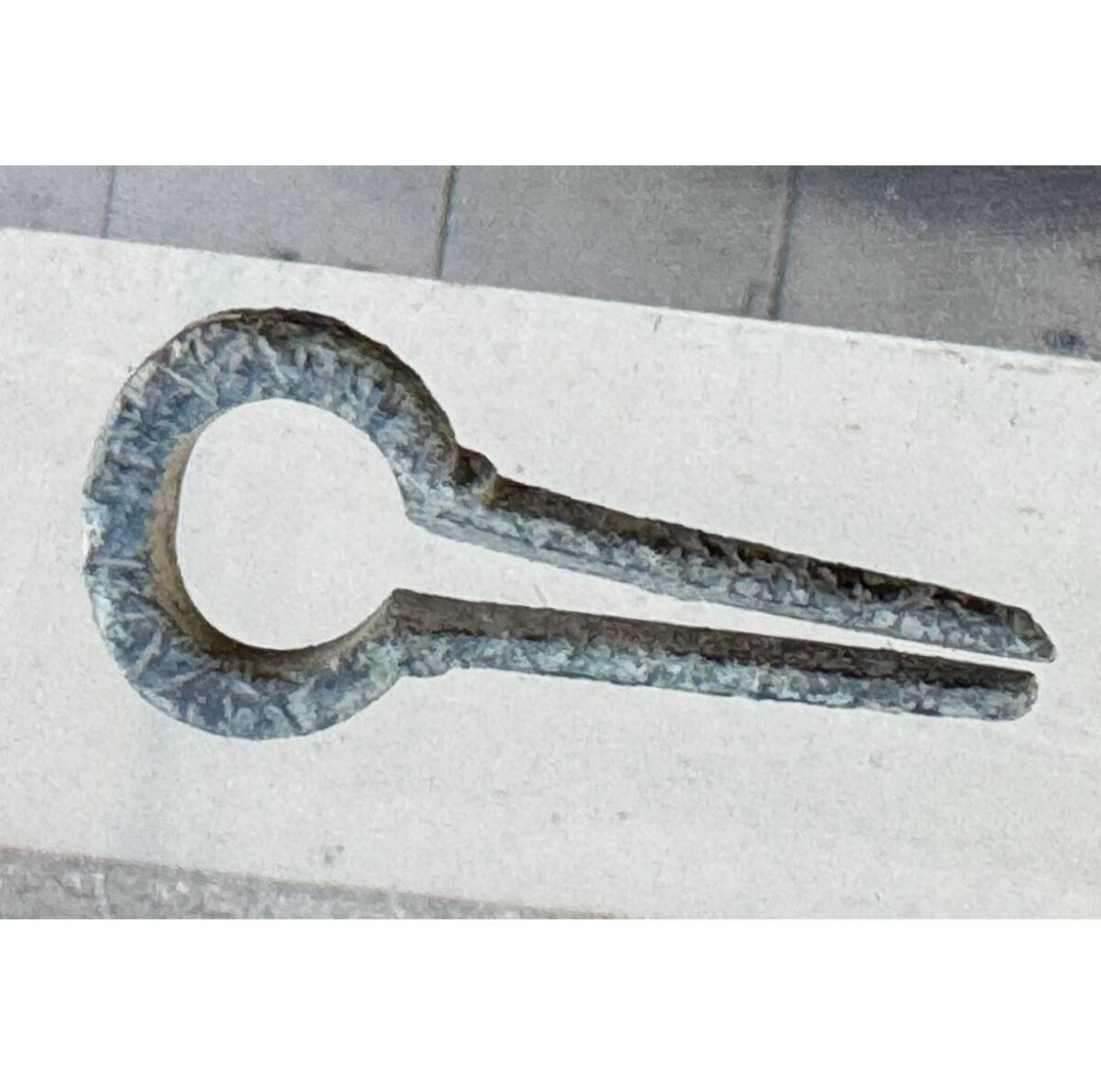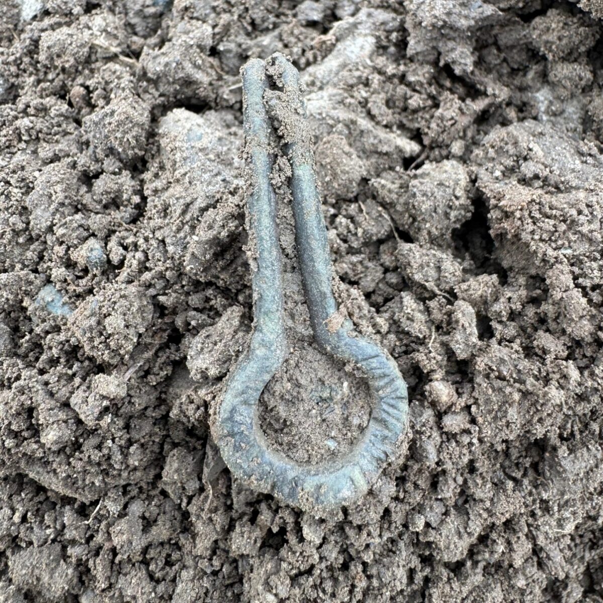 Beskrivelse: Grindheim i Etne harpa. Dekorert med dype skråstilte streker og furer. Funnet så undrende, der ute i den gode potetåkeren. Den gir nok ikke lenger noen lyd, da den under tiden har mistet sin tunge, den har tapt sin fjær. Materiale: Kobberlegering Lengde: 49 mm Bredde: 21 mm Funnet av: Jan Terje Rafdal Dato: 13 april 2025 Fylke: Vestland Kommune: Etne Type terreng: Dyrket markDetaljer: