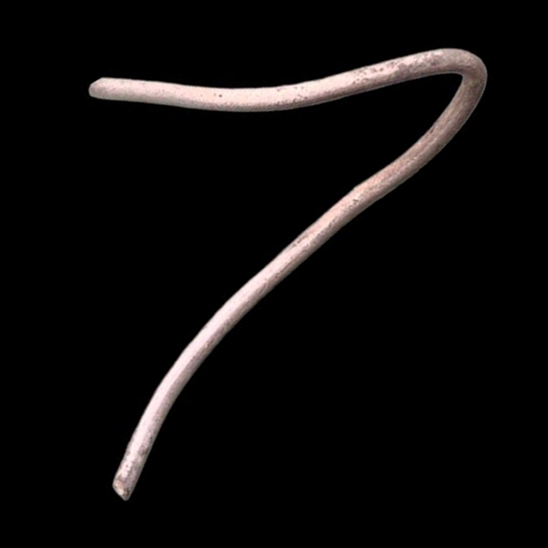 Beskrivelse: Sølvtråd - Hakkesølv, bruddsølv, oppbrutte og opphugde mynter og sølvsmykker - sølvbiter brukt som betalingsmiddel i stedet for penger - Veid veiet opp på skålvekta - Verd sin vekt i godt sølv - Betalingssølv - Årstall: 793-1066 e.Kr. Tidsepoke: Vikingtid Materiale: Sølv Lengde: 53 mm Tykkelse: 1 mm Vekt: 0,41 gram Funnet av: Ola Andreas Vestby Sandlie Dato: 1 november 2022 Fylke: Innlandet Kommune: Grue Type terreng: Dyrket mark Innlevert til: Fylkesarkeologen i Innlandet fylkeskommune.Detaljer: