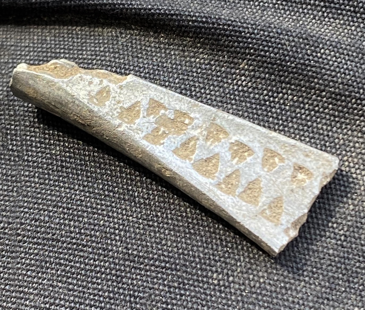 Beskrivelse: Hakkesølv, bruddsølv, oppbrutte, og opphugde mynter og sølvsmykker - sølvbiter brukt som betalingsmiddel i stedet for penger - Veid, veiet opp på skålvekta - Verd sin vekt i godt sølv - Betalingssølv - Bit av et stempeldekorert smykke. Årstall: 793-1066 e.Kr. Tidsepoke: Vikingtid Materiale: Sølv med dekor, del av et oppdelt smykke. Lengde: 29 mm Bredde: 5-10 mm Tykkelse: 2-6 mm Vekt: 4,08 gram Funnet av: Per-Arne Henriksen Dato: 23 august 2023 Fylke: Innlandet Kommune: Stange Type terreng: Dyrket mark Innlevert til: Fylkesarkeologen i Innlandet fylkeskommune.Detaljer: