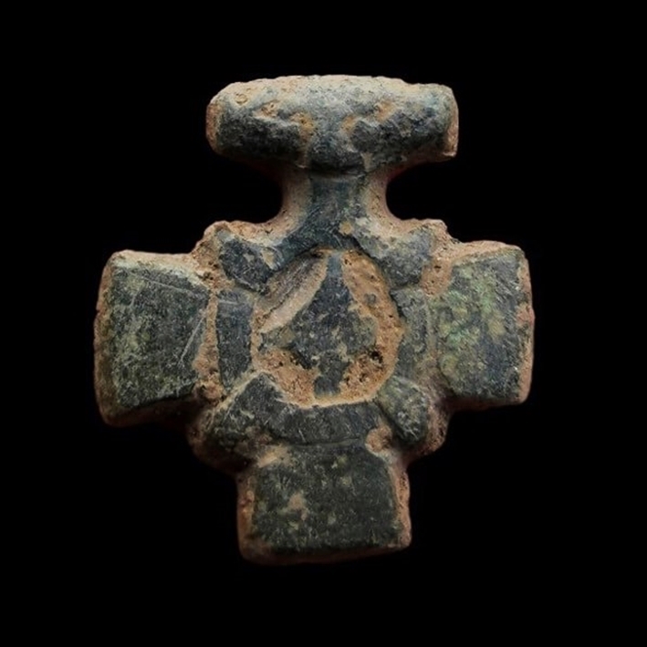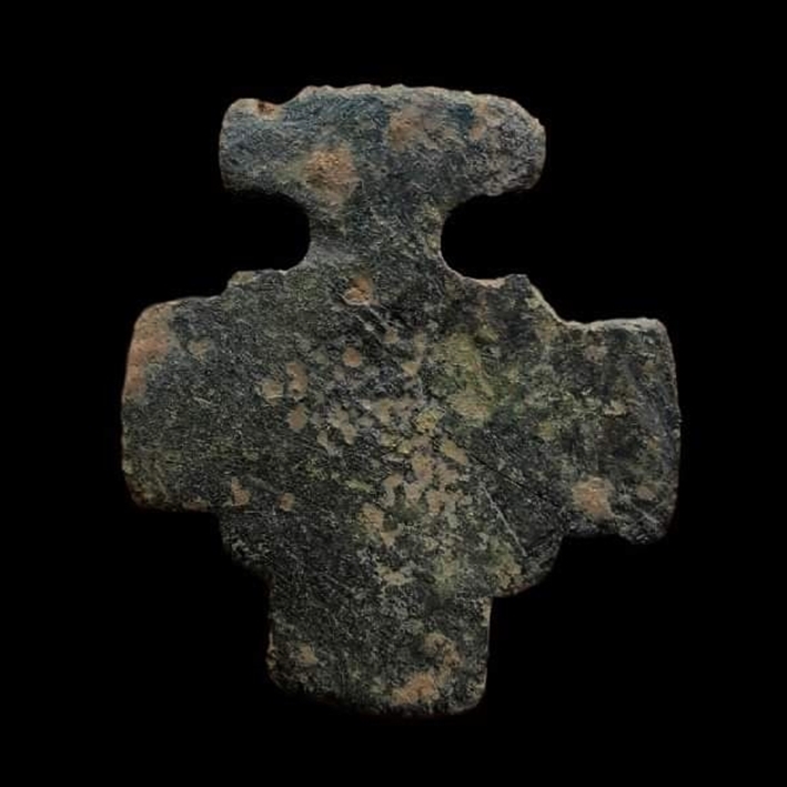 Beskrivelse: Patrise en støpe press modell til et korsformet hengesmykke fra vikingtiden, nærmere ca 870-970. Lignende matcherende funn gjort i England, modeller for å lage anhengsmykker blandt varianter av Hiddensee - Rügen type. Årstall: 793-1066 e.Kr. Tidsepoke: Vikingtid Materiale: Kobberlegering Bredde: 40 mm Høyde: 45 mm Tykkelse: 4-6 mm Vekt: 25,5 gram Funnet av: Kenny Hansen Dato: 31 august 2019 Fylke: Hedmark Kommune: Stange Type terreng: Dyrket mark Innlevert til: Fylkesarkeologen i Hedmark fylkeskommuneDetaljer:
