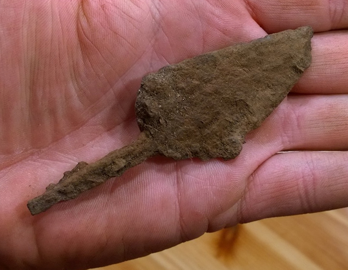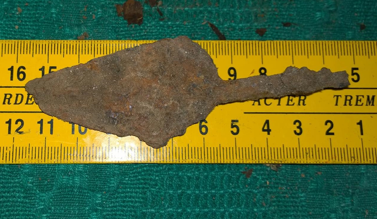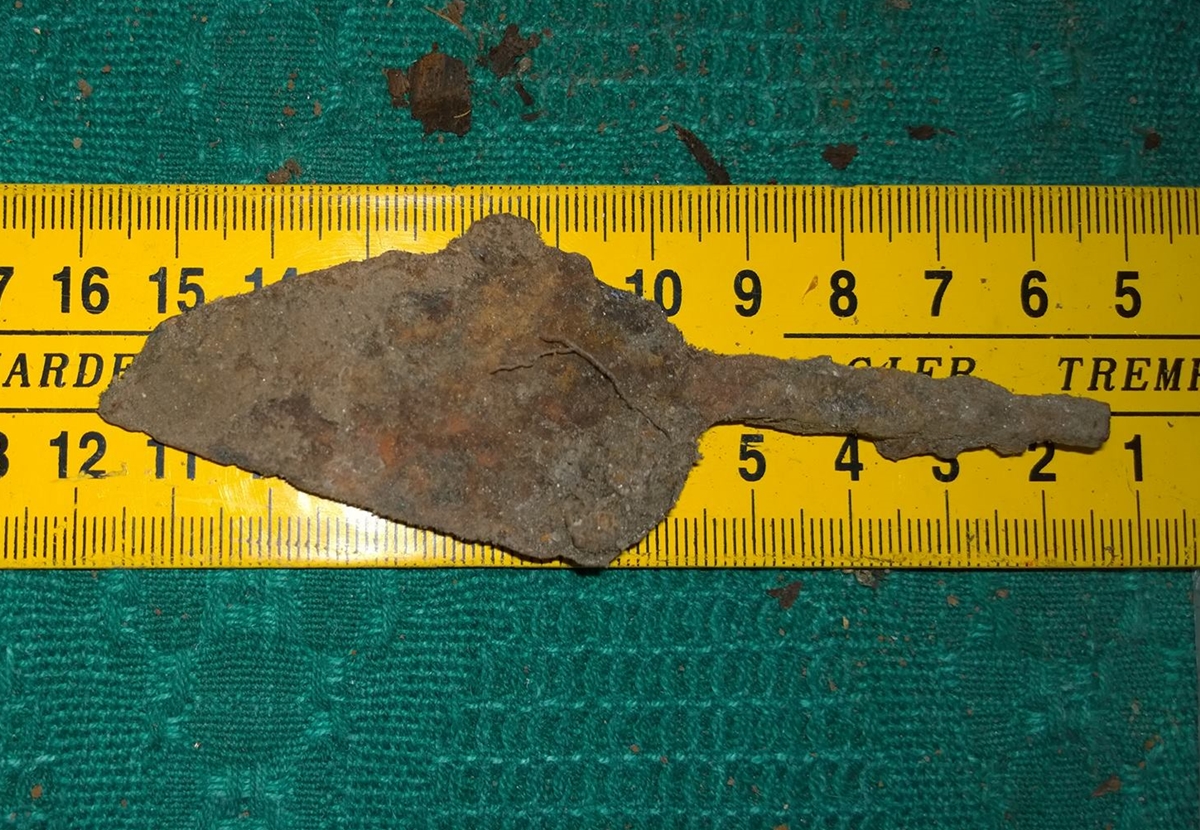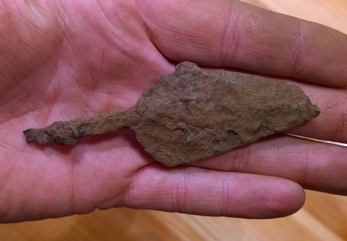 Beskrivelse: Armbrøstpil med tange. Tidsepoke: Middelalder Materiale: Jern Lengde: 10,5 cm Annen info: 1 bilde merket: Unimus-KHM-photo: Birgit Maixner. Funnet av: John Viggo Eliassen Dato: 25 juni 2014 Fylke: Akershus Kommune: Kirkebygda i Enebakk Innlevert til: Fylkesarkeologen i Akershus fylkeskommune.Detaljer: