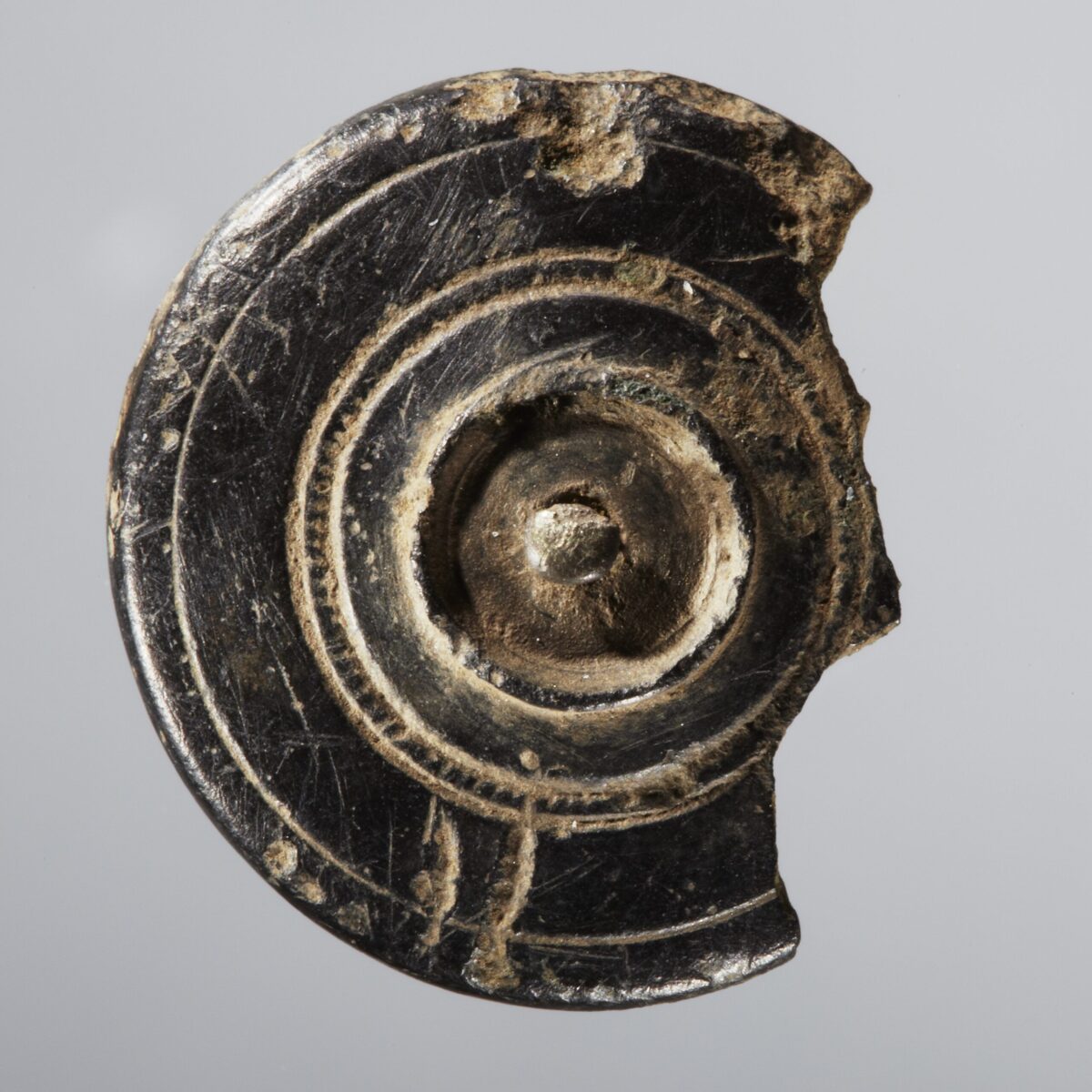 Beskrivelse: En sirkulær draktspenne med konsentrisk dobbel linjedekor, og baksiden har nålefeste bevart.