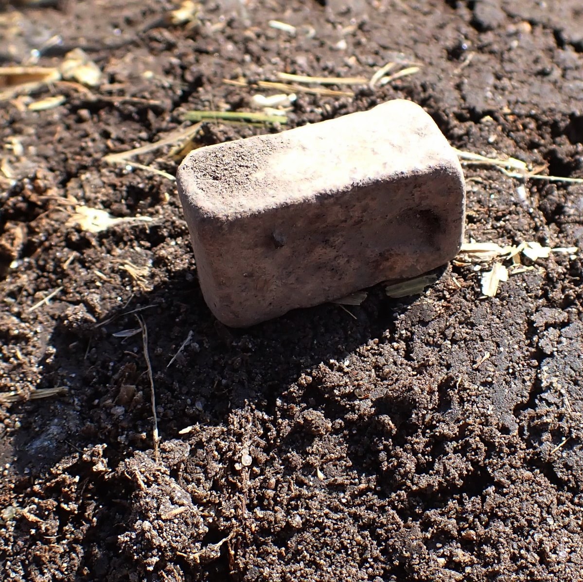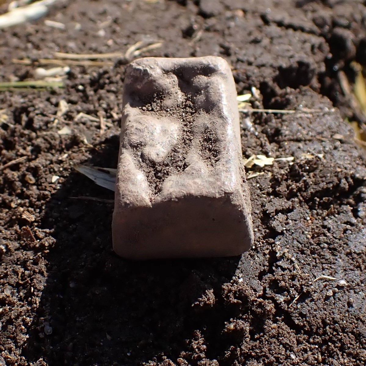Beskrivelse: Et rektangulært vektlodd, med ubestemmelig dekor på toppflaten. Om det kan ha vært festet et beslag der, som under tiden er plukket, av eller tapt i jorden. Tidsepoke: Vikingtid Materiale: Bly Lengde: 22 mm Bredde: 14 mm Høyde: 11 mm Vekt: 25,51 gram Funnet av: Mikkel Killingmoe Christensen Dato: 22 august 2021 Fylke: Ytre Østfold i Viken Type terreng: Dyrket mark Innlevert til: Fylkesarkeologen i Viken fylkeskommune.Detaljer: