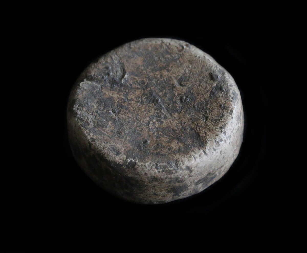 Beskrivelse: Vektlodd av bly, rundt flatt sylindrisk form. Materiale: Bly Bredde: 40 mm Høyde: 16 mm Vekt: 200 gram Funnet av: Øivind Moe Dato: 1 oktober 2020 Fylke: Innlandet Kommune: Dyrket mark Type terreng: Fylkesarkeologen i Innlandet fylkeskommuneDetaljer:
