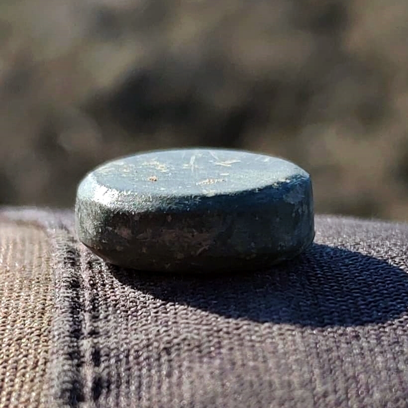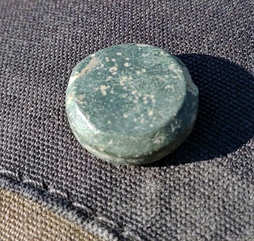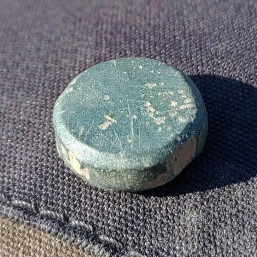 Beskrivelse: Sylinderformet vektlodd, handelsvektlodd til skålvekt. Årstall: 793-1066-e.Kr. Tidsepoke: Vikingtid Materiale: Kobberlegering Tykkelse: 3,5 mm Diameter: 11 mm.Ø. Vekt: 2,8 gram Funnet av: Frode Johansen Dato: 17 april 2021 Fylke: Østfold i Viken Kommune: Askim - Indre Østfold Type terreng: Dyrket mark Innlevert til: Fylkesarkeologen i Viken fylkeskommune.Detaljer: