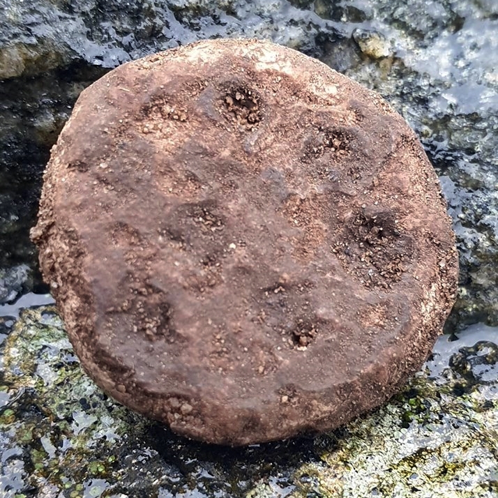 Beskrivelse: Vektlodd av bly, rundt flatt sylindrisk, med prikk dekor, av 7 øyne i tallet. Årstall: 793-1066 e.Kr. Tidsepoke: Vikingtid Materiale: Bly Tykkelse: 4 mm Diameter: 24 mm Vekt: 19,27 gram Funnet av: Johnny Nordmarken Dato: 22 september 2019 Fylke: Vest-Agder Kommune: Kristiansand Type terreng: Dyrket mark Innlevert til: Fylkesarkeologen i Vest-Agder fylkeskommune.Detaljer: