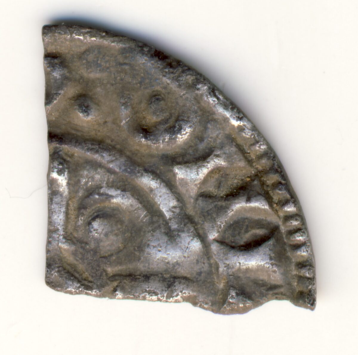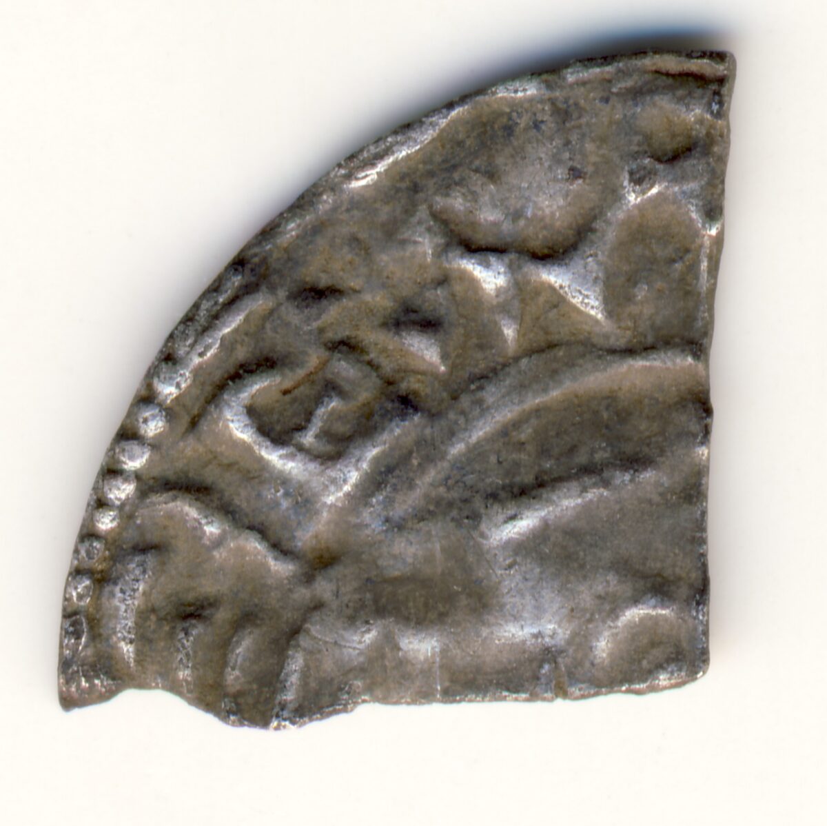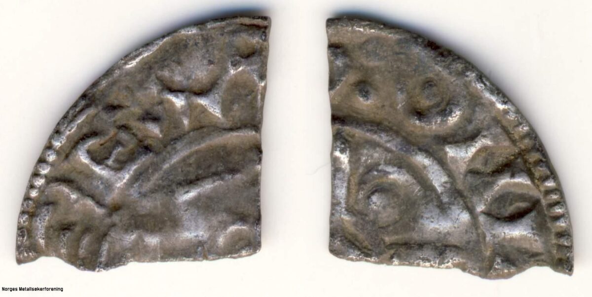 Beskrivelse: Pointed Helmet type Årstall: 1024-1030 Tidsepoke: Late Anglo-Saxon period (924-1066) Myntherre: Canute the Great - Knut den Mektige Tittel: Konge (1016-1035) Land: England Materiale: Sølv Vekt: 0,234 gram Advers: EX A (Utklipp av en variant av CNUT REX A) Revers: ON L (Utklipp av stedsangivelse) Annen info: Mynten er klippet langs korsarmene for å endre valøren fra penny til farthing. Med tanke på innskriften og de kjente myntstedene av Hildebrand type G i Hildebrand er mynten fra Lewes, Leicester, Chester, Lincoln eller London. Funnet av: Kjell Gunnar Lien Dato: 2012 Fylke: Oppland Type terreng: Dyrket mark Innlevert til: FA i OpplandDetaljer: