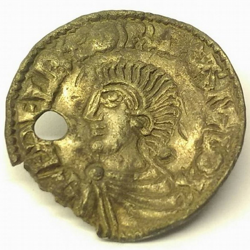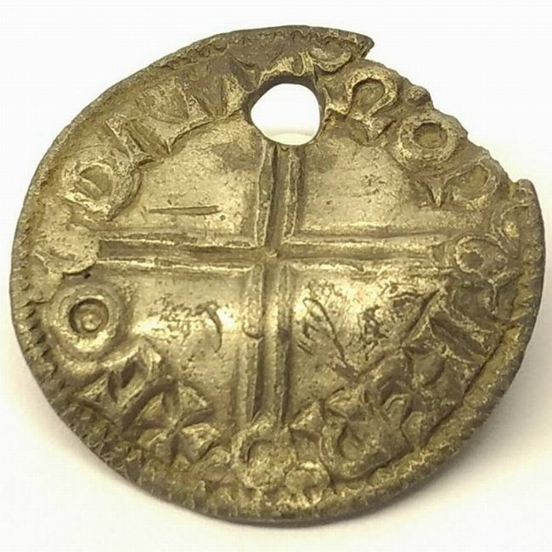 Beskrivelse: Long Cross type Årstall: 997-1003 Tidsepoke: Late Anglo-Saxon period (924-1066) Myntherre: Ethelred the Unready (Den Rådville) Tittel: Konge (978-1016) Land: England Myntsted: Worcester Myntmester: Goda Materiale: Sølv Diameter: 19,6 mm Vekt: 1,55 gram Advers: ✠ ÆÐELRÆD REX ANGLOX Revers: ✠ GΘDA M𐩐Ω𐩐O ǷIHER Annen info: Spink 1151. Perforert Funnet av: Victor Pedersen Dato: 2017 Fylke: Buskerud Type terreng: Dyrket mark Innlevert til: FA BuskerudDetaljer: