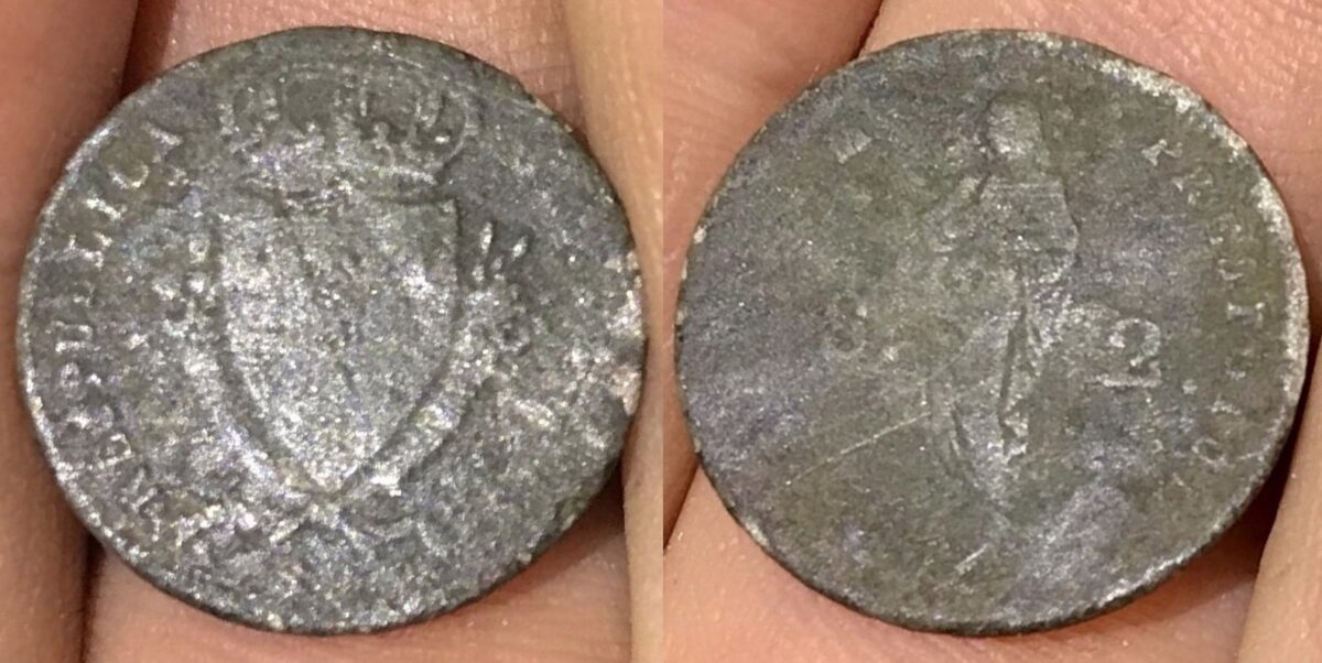 Årstall: 1814 Myntherre: Adelsrepublikken Genova (1814-1814) Land: Italia Stat: Genova Region: Liguria Myntsted: Genova Materiale: Sølv - 287‰ Diameter: 18 mm Vekt: 2,1 gram Advers: RESPUBLICA GENUENSIS Revers: SUB TUUM PRESIDIUM Revers midt: S. 2. Funnet av: Kenneth Olsen Dato: 2020 Fylke: Vestfold og TelemarkDetaljer:
