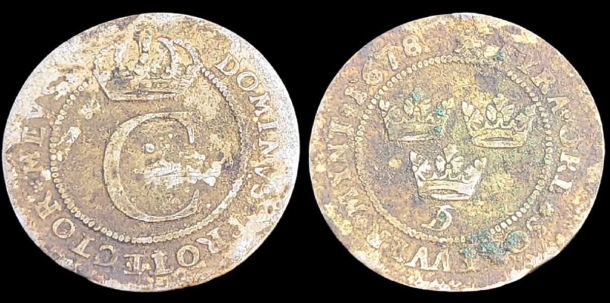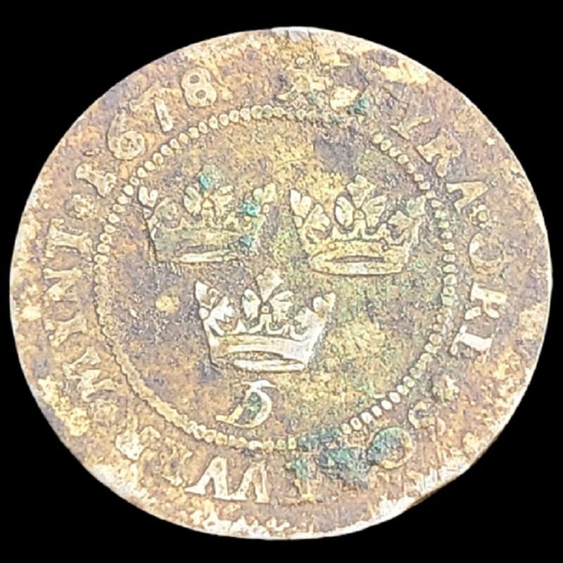Årstall: 1678 Myntherre: Carl XI Land: Sverige Myntsted: Stockholm Myntmester: Daniel Faxell Myntmesterinitialer: DF (som monogram) Materiale: Sølv - 444‰ Advers: DOMINVS ❀ PROTECTOR ❀ MEVS ❀ Revers: FYRA ❀ ÖRE ❀ SÖLFWERMYNT ❀ 1678. Funnet av: John Nord Dato: 2022 Fylke: Vestland Kommune: VossDetaljer: