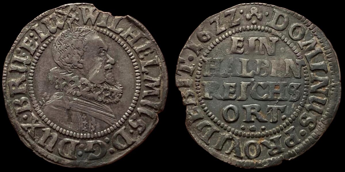 Beskrivelse: 1/8 Thaler - 1/2 Reichsort Årstall: 1622 Myntherre: Wilhelm VI August Tittel: Hertug (1603-1642) Land: Tyskland Delstat: Niedersachsen Stat: Braunschweig-Lüneburg-Harburg Myntsted: Harburg Myntmester: Thomas Timpfe den Yngre Myntmestermerke: Materiale: Sølv - 888‰ Diameter: 27 mm Advers: WILHELMUS • D፡G፡ DUX • BRU፡ E፡ LU Revers: DOMINUS • PROVIDEBIT • 16ZZ • Revers midt: EIN • HALBEN REICHS ORT• •፡• Annen info: Sjelden og flott! Funnet av: Magne Øksnes Dato: 19-10-2022 Fylke: Trøndelag Innlevert til: FA TrøndelagDetaljer:
