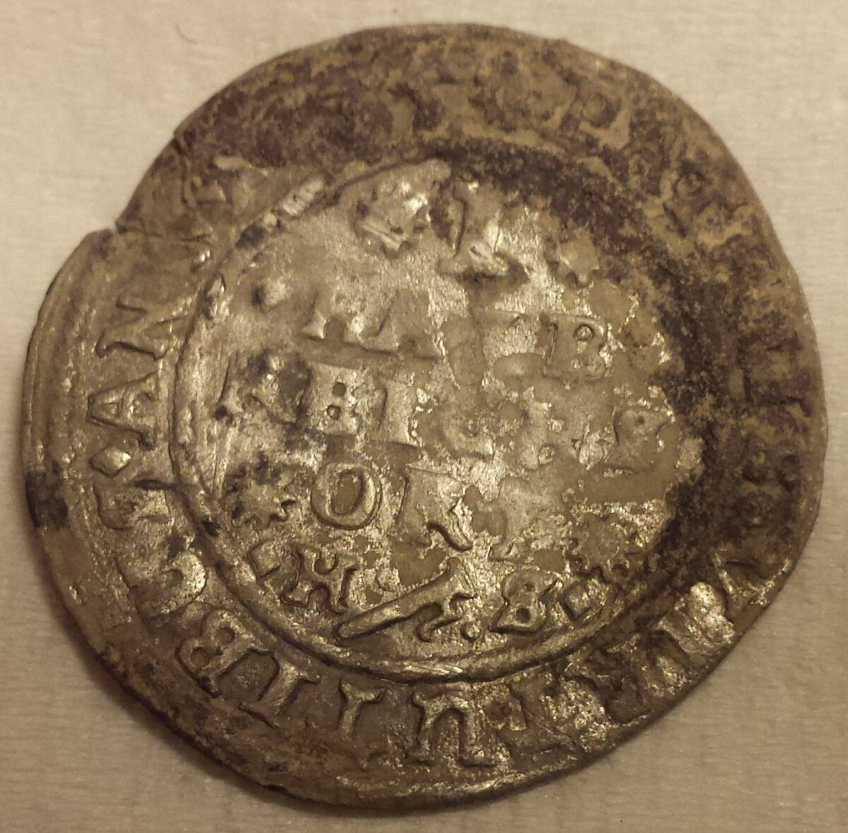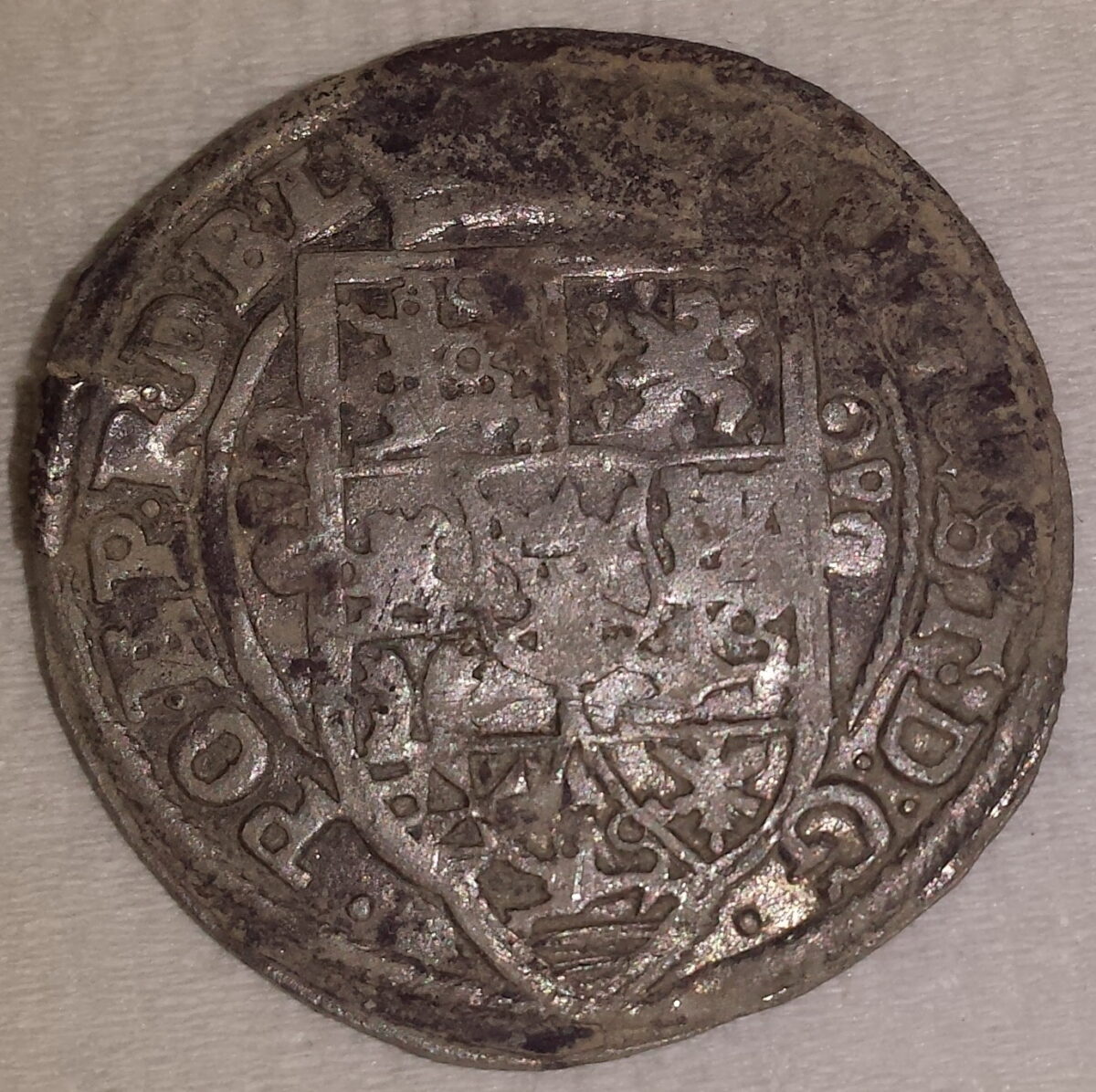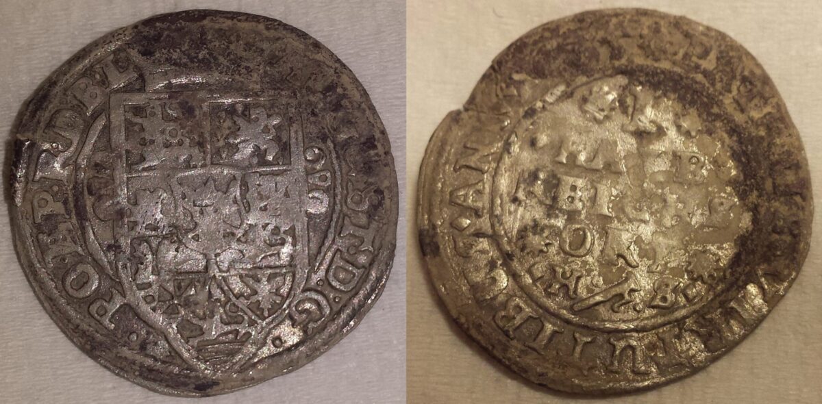 Beskrivelse: 1/8 Thaler - 1/2 Reichsort Årstall: 1635 Myntherre: August I den Eldre Tittel: Hertug (1633-1636) Land: Tyskland Delstat: Niedersachsen Stat: Braunschweig-Lüneburg-Celle Myntsted: Clausthal Myntmester: Henning Schreiber Myntmestermerke: H Materiale: Sølv - 888‰ Diameter: 25 mm Vekt: 3,2 gram Advers: AUGUST• D፡G• PO• EP• R•D•B•L• Revers: PATRIIS ⬫ VIRTUTIBUS ⬫ ANNO ⬫ 1635 ✷ Revers midt: ✷ I ✷ ⬫HALB⬫ REICHS ✷ ORT ✷ ⬫H• Funnet av: Arild Haugli Dato: 2014 Fylke: Akershus Type terreng: Dyrket markDetaljer: